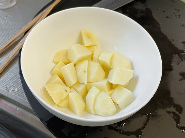 じゃがいもは一口大に切って、電子レンジ600Wで3分ほど加熱します。竹串がスーッと通るようになればOKです。