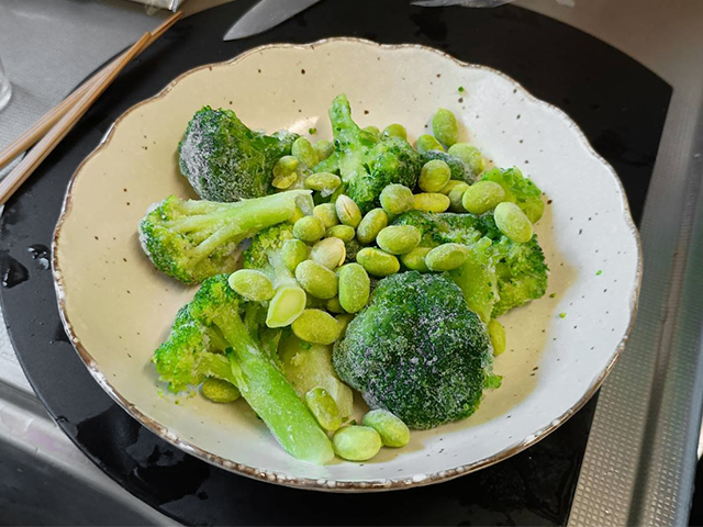 冷凍のブロッコリーと枝豆は電子レンジ600Wで1分ほど加熱し、解凍します。解凍したら水気をよく切っておきましょう。