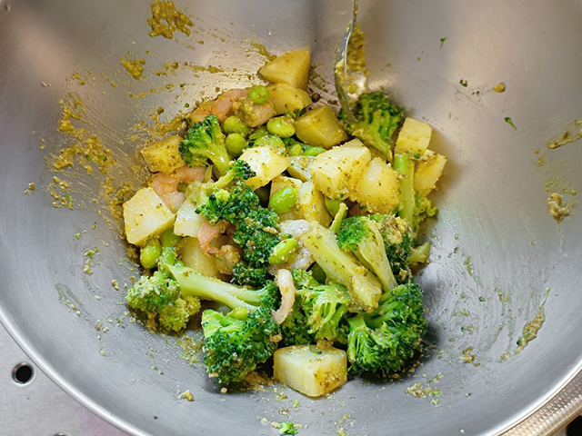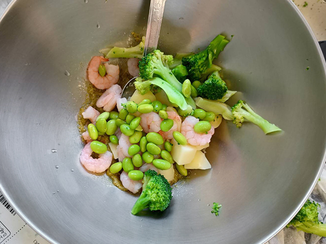 調味料を混ぜ合わせたボウルに、解凍したエビ、ブロッコリー、枝豆、レンチンしたじゃがいもを入れます。