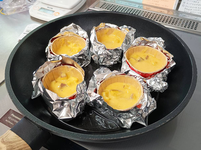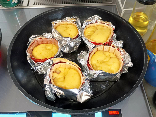 フライパンに水を入れて蒸すので紙製のカップの場合は、アルミホイルなどで包んで水でふやけないようにします。