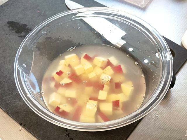 さつまいもは1センチ角くらいの角切りにして、ボウルに水を入れ、さつまいもを軽く洗います。すぐに使うので水につけておかなくても大丈夫です。