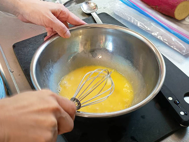 卵に油と砂糖を入れて、泡だて器などでよく混ぜ合わせます。