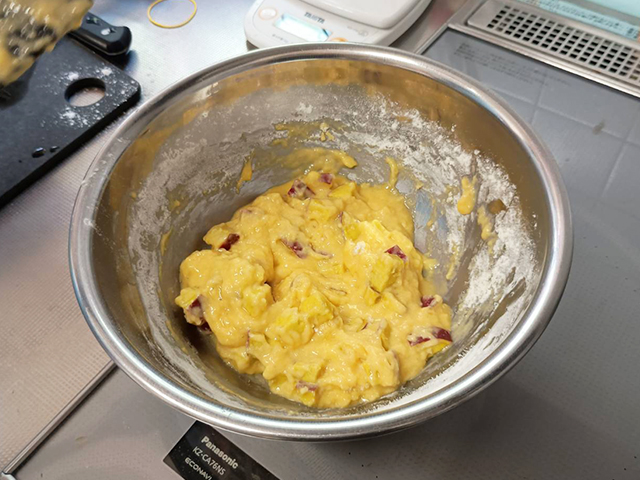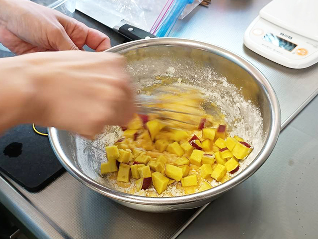 さつまいもを入れて、軽く混ぜ合わせます。