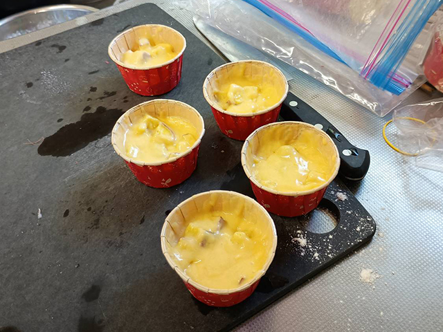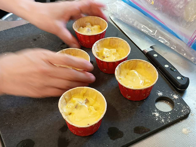 カップに生地を入れます。カップの半量くらいを目安に入れましょう。