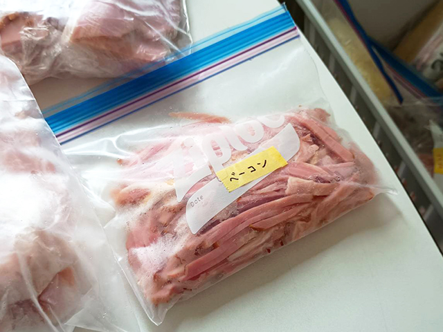 さんさんでは、ベーコンは細切りにして、必要な分だけサッと取り出せるようにフリーザーバッグに入れています。