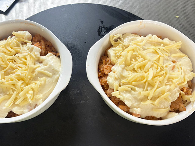 耐熱容器にチキンライスを入れ、ホワイトソース、シュレッドチーズの順で乗せていきます。