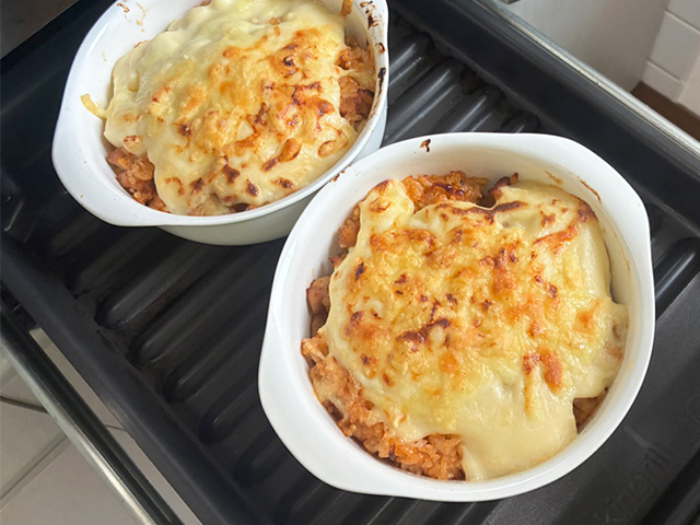 チキンライスの上にホワイトソースを乗せて、さらにその上からシュレッドチーズを乗せてグリルで焼くだけ♪