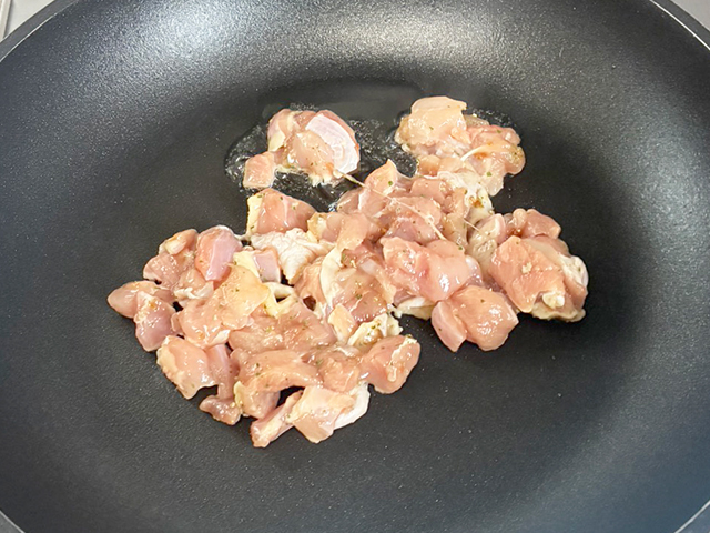 フライパンにサラダ油大さじ1を弱めの中火で熱し、鶏肉を炒めます。