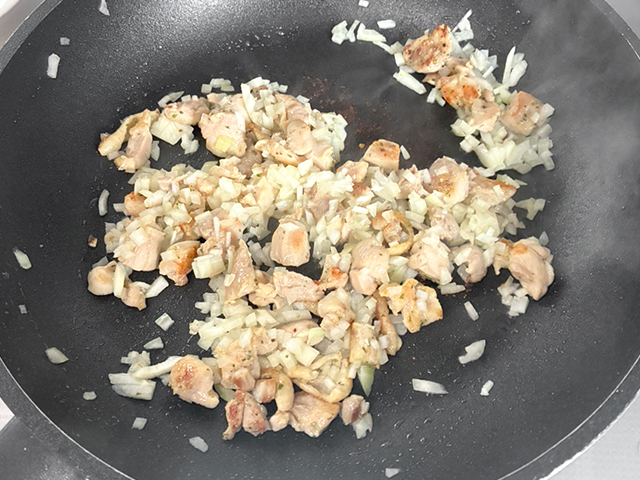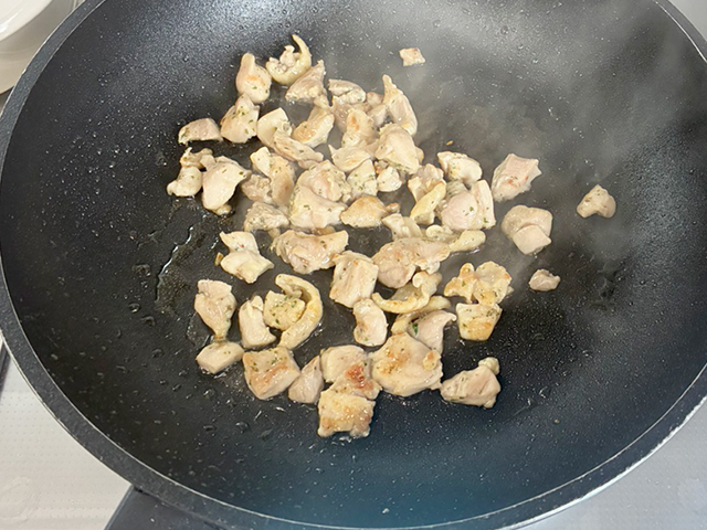 焼き色がつき、全体に鶏肉の色が変わるまで炒めます。