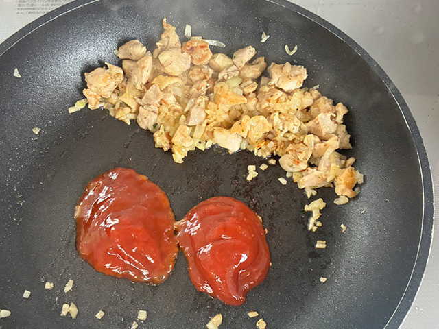 鶏肉と玉ねぎをフライパンの隅のほうに寄せて、空いたスペースにケチャップを入れ、中火で酸味を飛ばします。