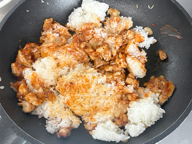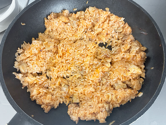 ごはんを加えてほしぐしながら、フライパン全体に広げ、ご飯がパラりとしてケチャップが全体に馴染むように混ぜ合わせます。