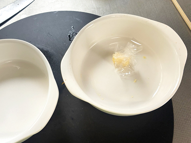バターを塗ることで、焼いたときにご飯やホワイトソースなどが容器にこびりつくのを防ぎます☆