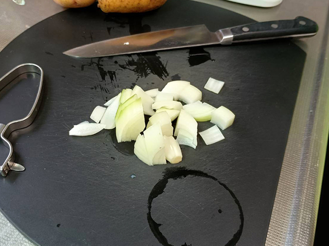 じゃがいもと玉ねぎを1.5センチ角くらいにカットして、そのまま自動調理ポットに入れてスイッチON!