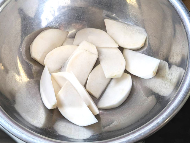 かぶは5ミリくらいの厚みに串切りにし、塩をひとつまみ振っておき、水分を出すため時間をおきます。
