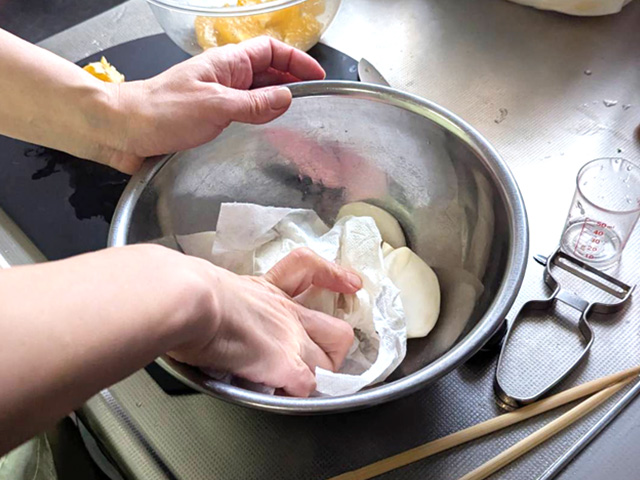 かぶはじんわりと水分が出てきたら、キッチンペーパーなどで水分をふき取ります。