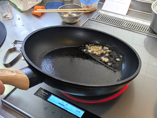 フライパンを温め、ごま油とにんにくを入れます。