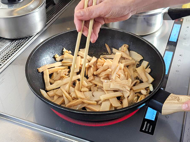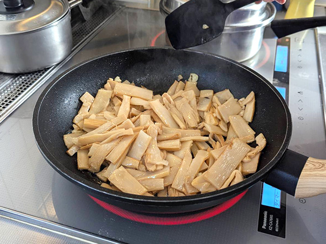メンマはあまり動かさずに3分ほど炒め、水分を飛ばします。