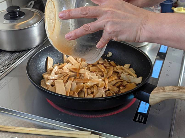 軽く焼き色が付いたら、調味料を入れて全体に絡めます。