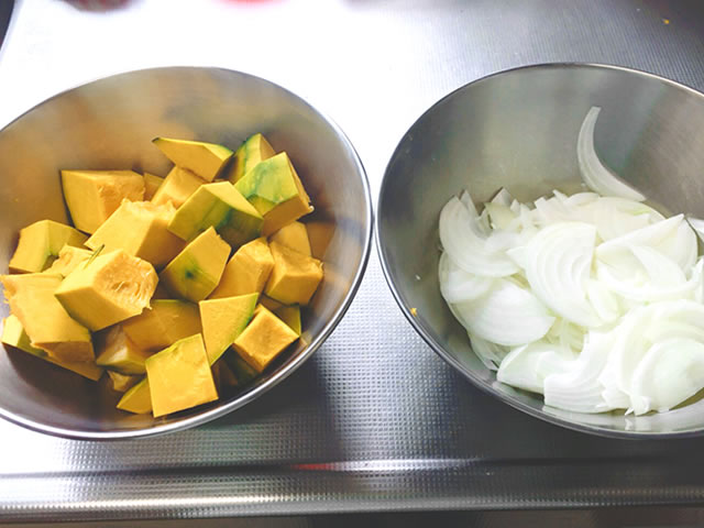かぼちゃは皮をむき一口大くらいの角切り、たまねぎはスライスしておきましょう。