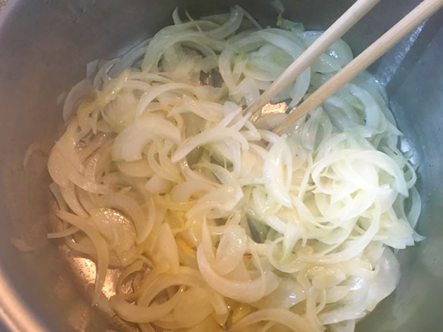 お鍋にバターとオリーブオイルを入れ、たまねぎを炒めます。
