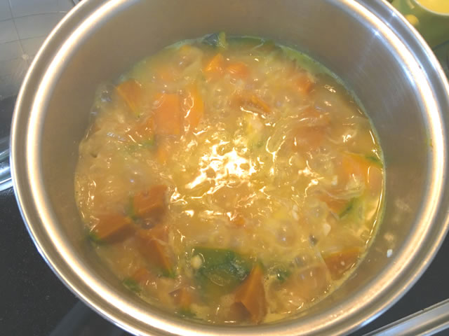 かぼちゃが柔らかくなったら、牛乳を加えます。