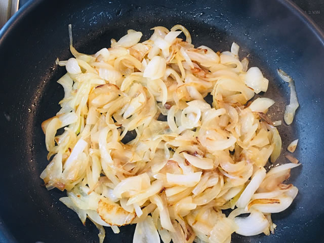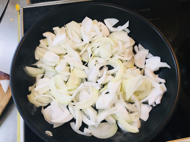 フライパンが温まったら大さじ2の油を入れて、薄切りした玉ねぎを入れます。