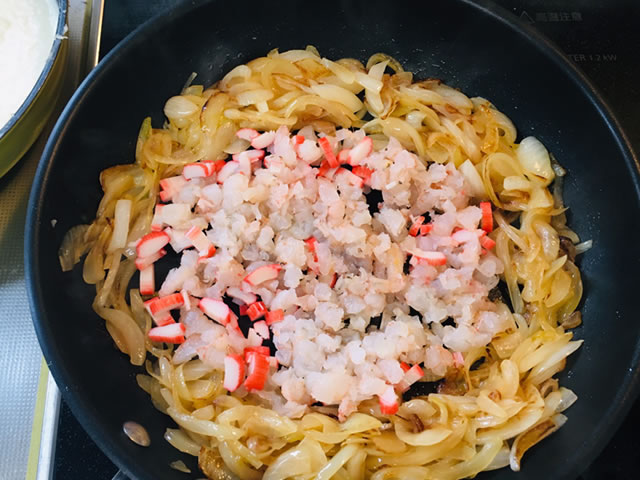 小エビは解凍して粗みじん切りに、カニカマは小口に切ります。