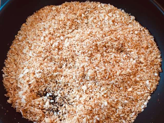 あとは容器にクリームコロッケの具を入れ、さきほど炒めたパン粉をかければ完成です。