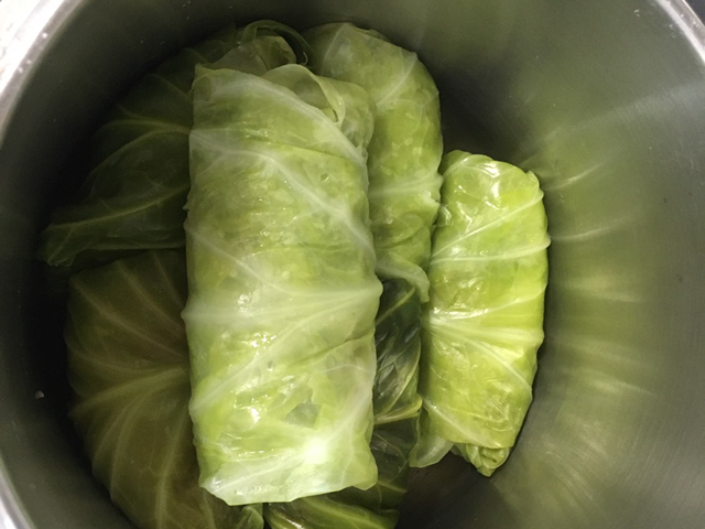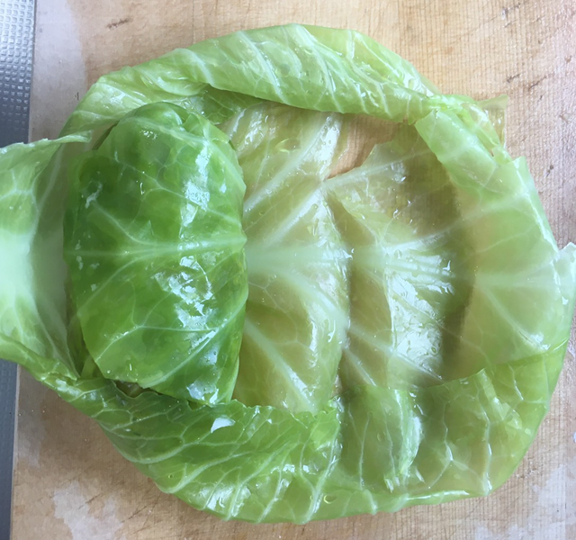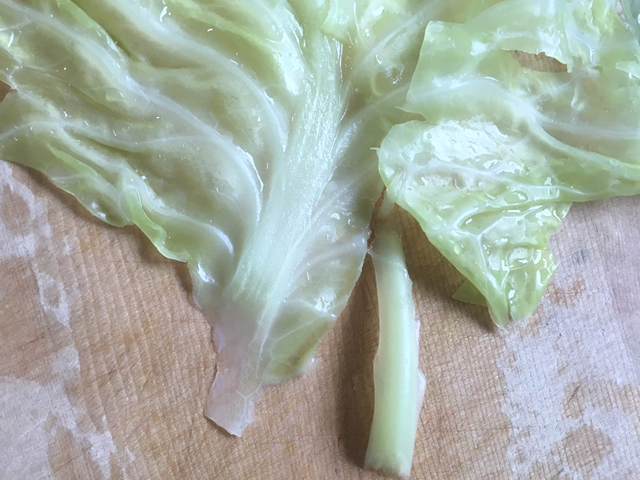 キャベツの葉8枚を10分程茹でて、冷ましておきます。