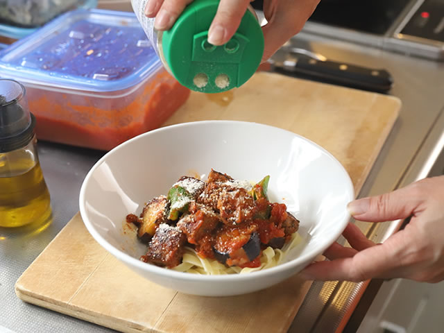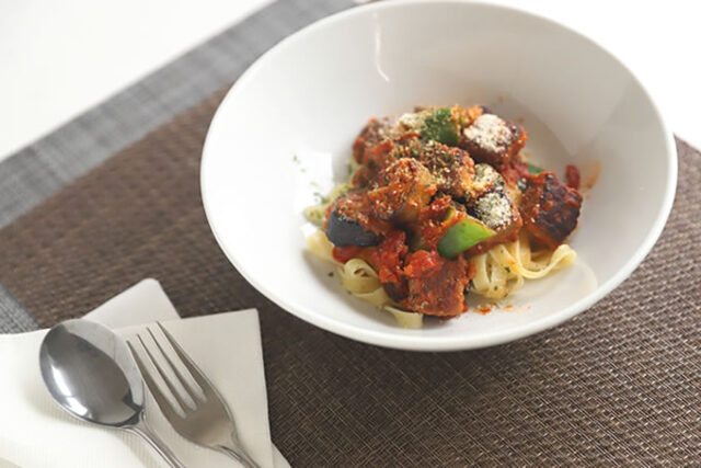 パスタには、トマトソースにからみやすい「タリアレッテ」を使用しました。