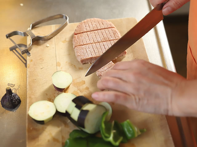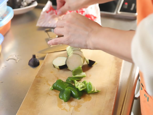 ナスは火のとおりを早くするように3ヶ所ほど皮を剥いて、ピーマンは食べやすい大きさに切ります。