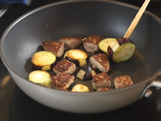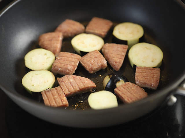 オリーブ油大さじ2をフライパンに引いて、ハンバーグ、ナス、ピーマンを焼きます。