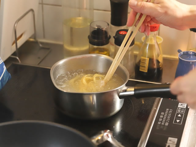 お湯が沸いたら塩小さじ1を入れ、パスタを表示どおりに茹でます。