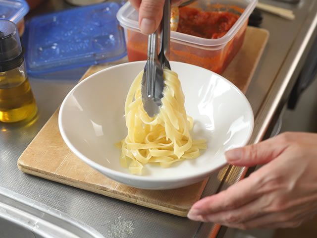 茹で上がったらザルにあげ、パスタ同士がくっつかないように、オリーブ油大さじ1をかけて和えます。