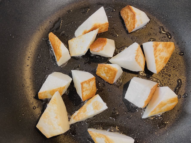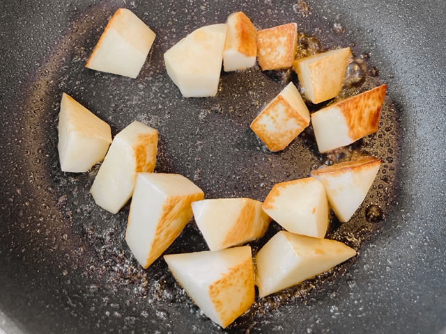長芋は食べやすい大きさ切り、フライパンを温めサラダ油を引いて長芋に焼き目がつくように炒めます。