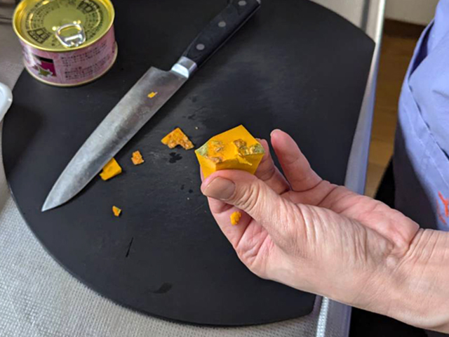 かぼちゃは食べやすい大きさにカットします。皮の硬いところは取り除いておきましょう。