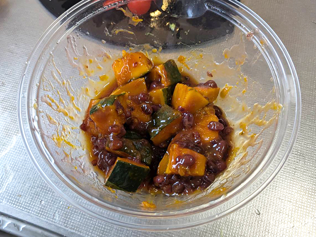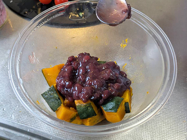 かぼちゃが冷めてから、ゆであずきを合わせましょう!
