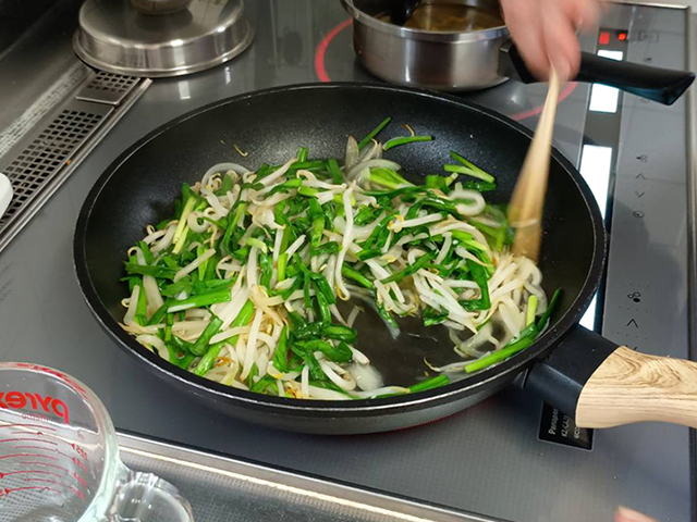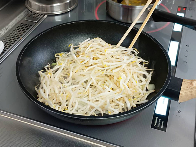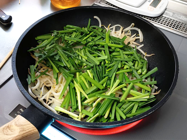 玉ねぎは透明になるまで炒め、もやしとニラは火が通るのが早いので、1分くらいを目安に炒めましょう。