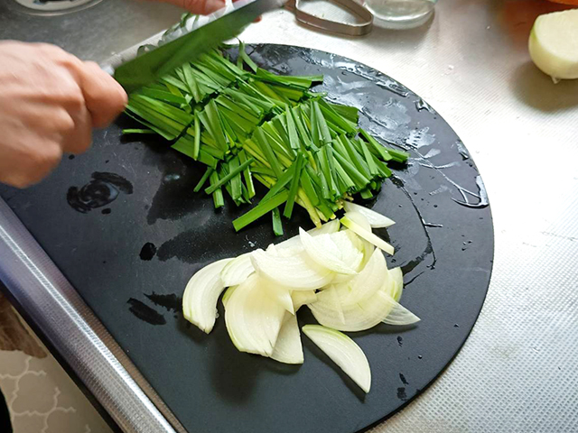 玉ねぎは薄くスライスし、ニラは5センチくらいの長さに切ります。