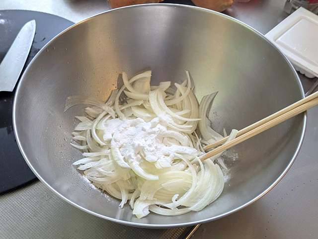 ボウルなどに玉ねぎ、砂糖、塩、片栗粉を入れます。
