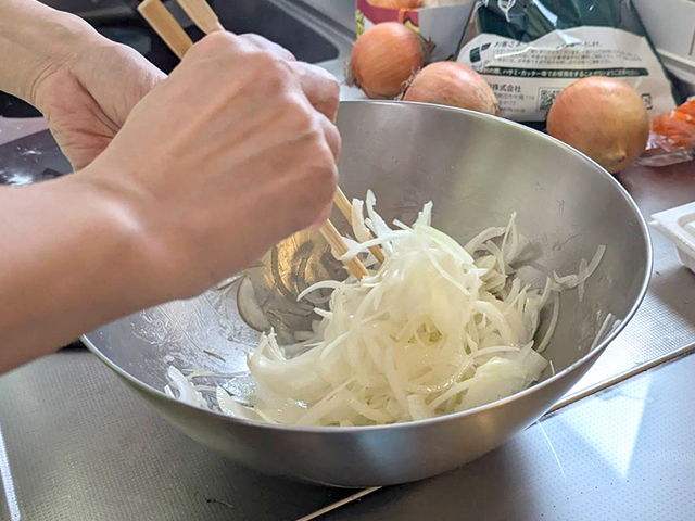 玉ねぎに調味料が絡むように混ぜ合わせ、5分のほど置きます。